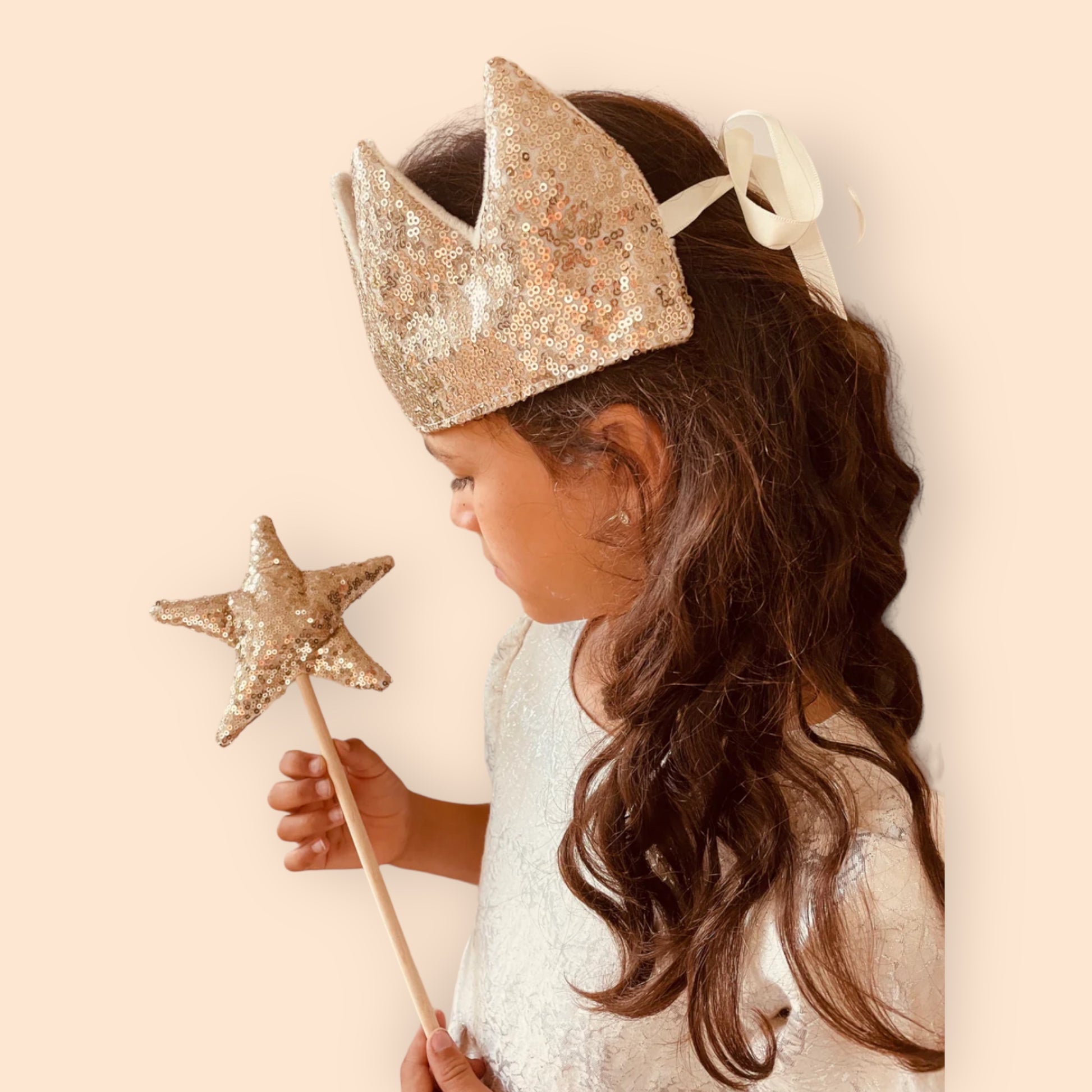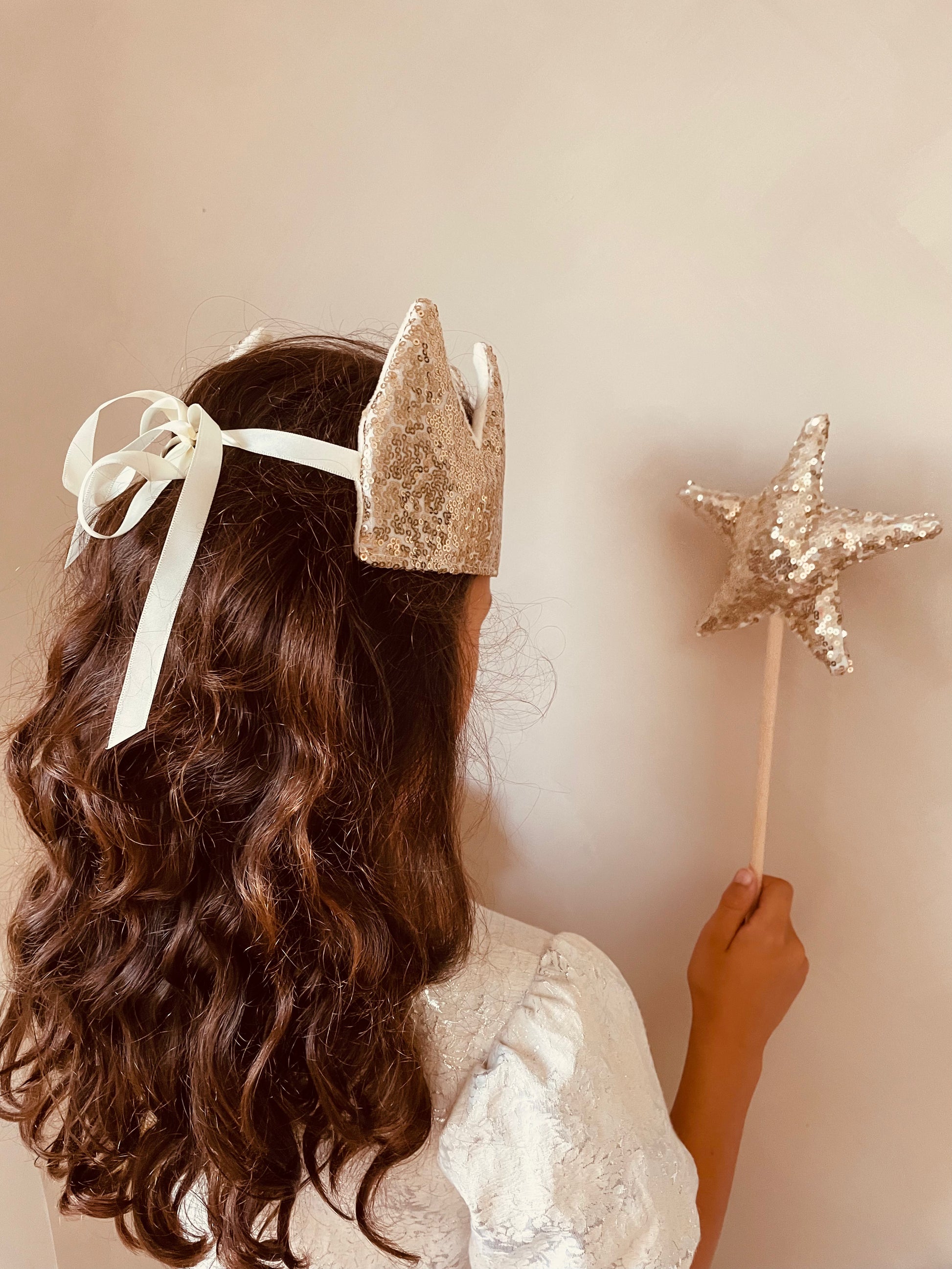 Backed onto a soft velvet material with gold sequins and a beautiful ribbon. This crown would be perfect for princess and dress up okay. The ribbon allows this to fit a 6month old to a 60 year old!!